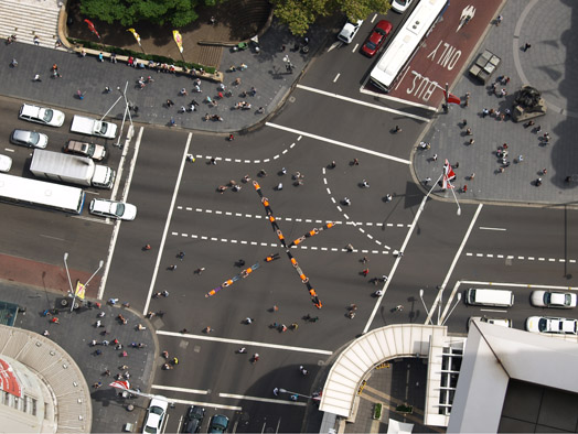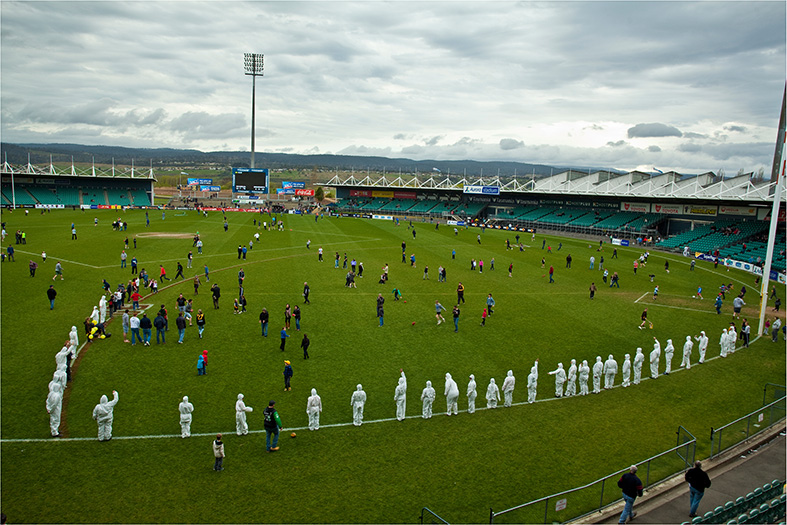 Along white lines is a project that joins art with sport and community. This work was performed by over 400 people during half time at the NTFA Grand Final at Aurora Football Stadium, Launceston, Australia in September 2011. This exhibition re-presents aspects of the project for your viewing pleasure.