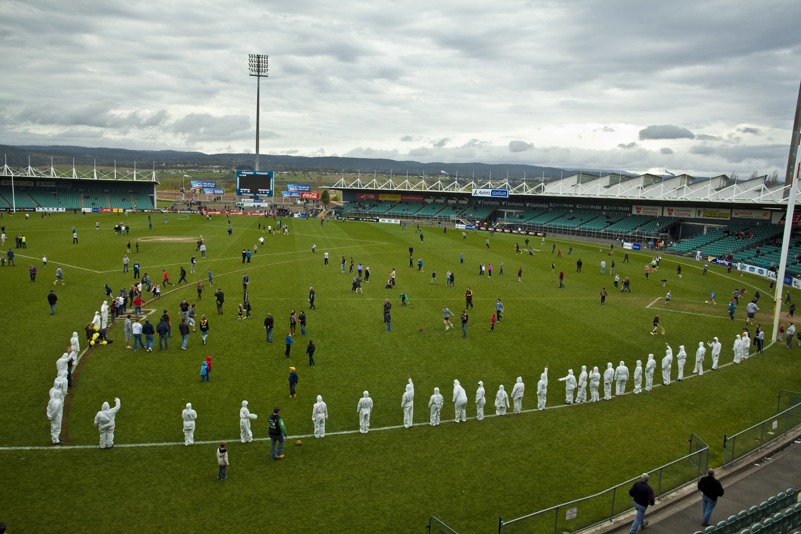 During the performance over 400 spectators, around 15% of the audience at the football event spontaneously particiapted in this work of performance art, completely covering the lines marking the centre square of the AFL football field. At the start of the performance when people dressed in white overalls jogged onto the field in a single file and started to become the white lines on the ground, the goalposts, the goal square and boundary line, the spectators were somewhat unsure of the work. Some of the audience joined in, but many more watched. There were even moments when some of the children on the field tried to kick balls at the performers. Then when the performers moved to become the 50 metre line and the boundary line, many more spectators joined in. The work culminated in the last movement, which saw a transformation – spectators embraced the work lying Along white lines completely covering the lines of the centre square.