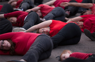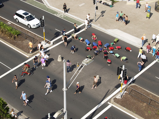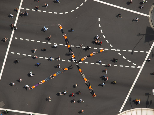 In this performance people are invited to wear black pants and shoes and their choice of red, blue or green t-shirts and make human geometric abstractions on the road during a busy part of the day. The patterns that are made during this intervention are very dependent upon the colours that people choose to wear, so the final choreographing takes place immediately before the performance.