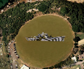 Sylvia Schwenk and Anne Zahalka propose to contemporise this history of camouflaging by creating a work of art made from human bodies. A side view of a Naval ship will be marked out on Middle Head Oval with military personnel from HMAS Penguin and civilians lying down side by side to create a ‘naval ship’ covered in Dazzle camouflage. This participatory performance will be videoed and photographically recorded from a Navy helicopter to capture this historic event in all its nuances to be produced as finished artworks.