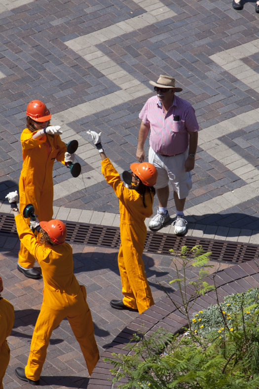 In the performance a group of everyday people-cum-performers draw attention to ordinary events or actions that normally go unnoticed. The performers will be dressed in orange overalls, orange hard hats and black boots 'carrying' sheets of pretend glass and performing other simple repetitive steps appropriate to the space. The site was selected due to the extensive construction works extending the MCA.In this performance everyday people crossed over to become performers pretending to be cars 'driven' in