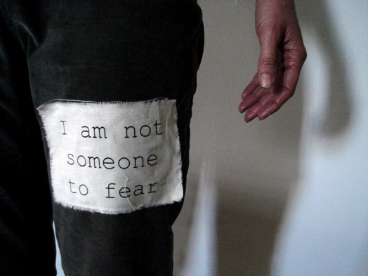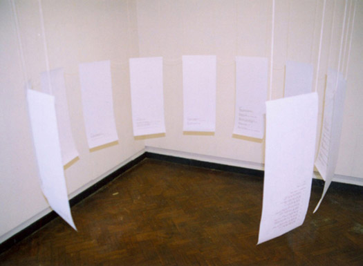 Three ’realities’ are presented in the work: Anja’s, the caretakers’, and ‘my reality’ (which serves as the reader’s view). These are printed on the wall of the gallery or as text on perspex, in script as if taken from a typed record of interview. As the viewer stops to read, his/her silhouette is cast in shadow from a light behind, imposing them directly into the trio of narratives.