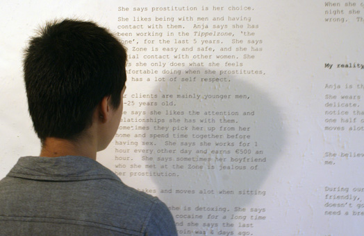 Anja’s reality is a text-based work about a prostitute who offers ‘drive-thru’ sex in a designated zone for prostitution, in a city in the Netherlands. In the zone men can legally pick up a prostitute when a daytime two-way street is turned into a one-way circuit around a railway station. Prostitutes gets into clients’ cars and they drive into a parking area, which is sectioned into bays with strip rubber fixed to steel framework as divider ‘walls’ where they