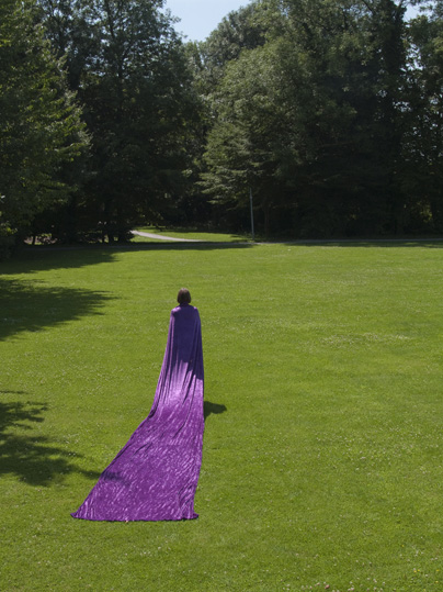 In the performance everyday-people-cum-performers hold aloft three sumptuous purple cloths on poles to form a canopy or palanquin. The procession moves through the streets of Schöppingen, a small town in Germany, and the performers raise the palanquins over people they meet who are going about their everyday activities. The performance, with its implications of bestowing importance and the sharing of a moment of richness and prestige is a small oasis, a moment of pageantry injecting something out of the ordinary into the known and the familiar: endowing a sense of worth and inclusion.