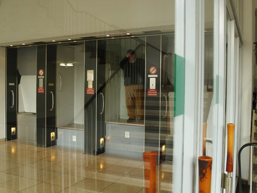 The workers move between floors unseen by shoppers, using an exclusive private elevator that allows them to step on and step off different levels in the shopping centre. The lift offers a peaceful and quiet means of transport; a moment of escape which belies the hectic noisy shopping environment that awaits them on the other side.